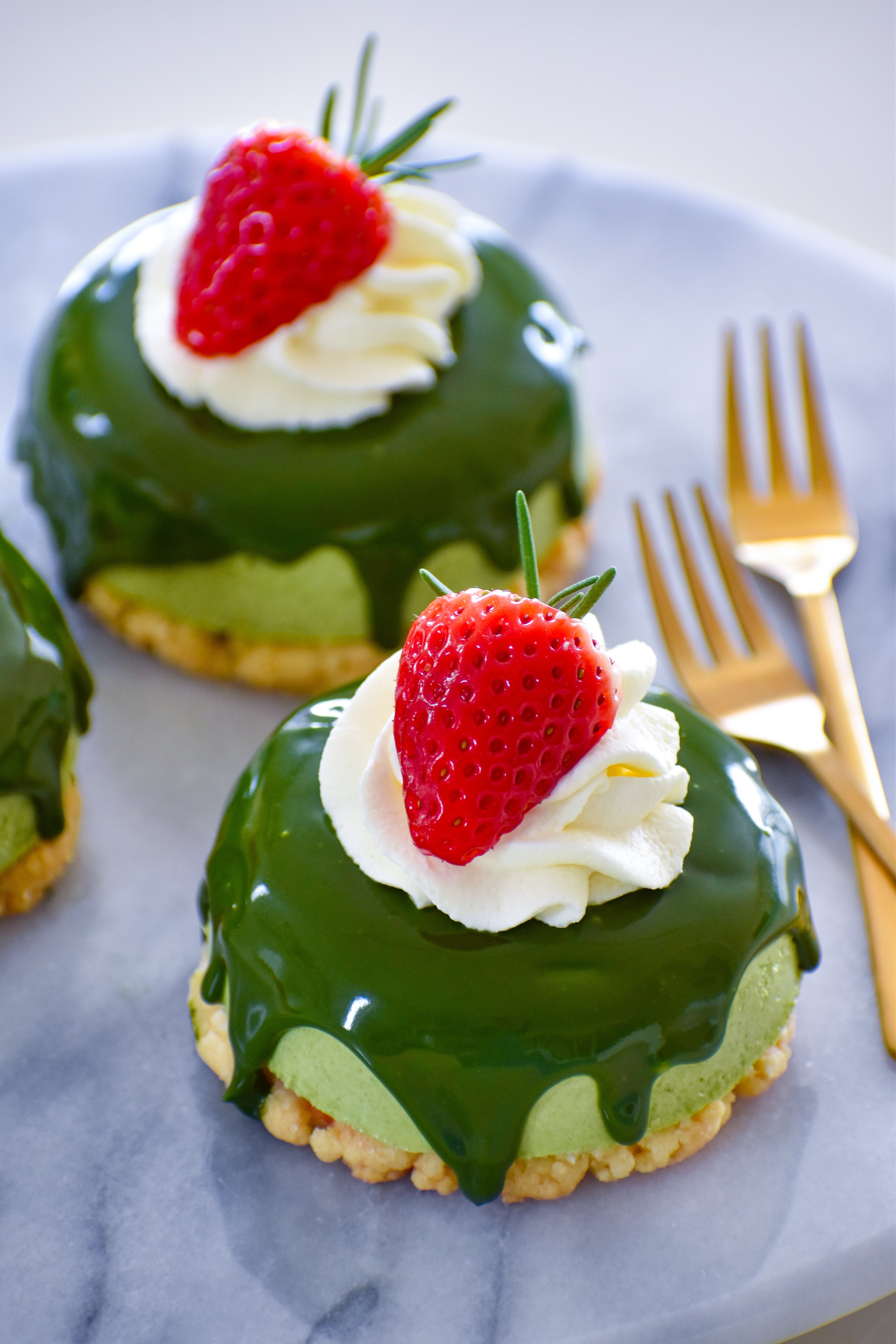 卵黄入りの濃厚な抹茶ババロアをクッキー生地の上に乗せ、濃いめの抹茶グラサージュ、いちごのコンフィチュール、クリームチーズ入りのクリームで仕上げます✨