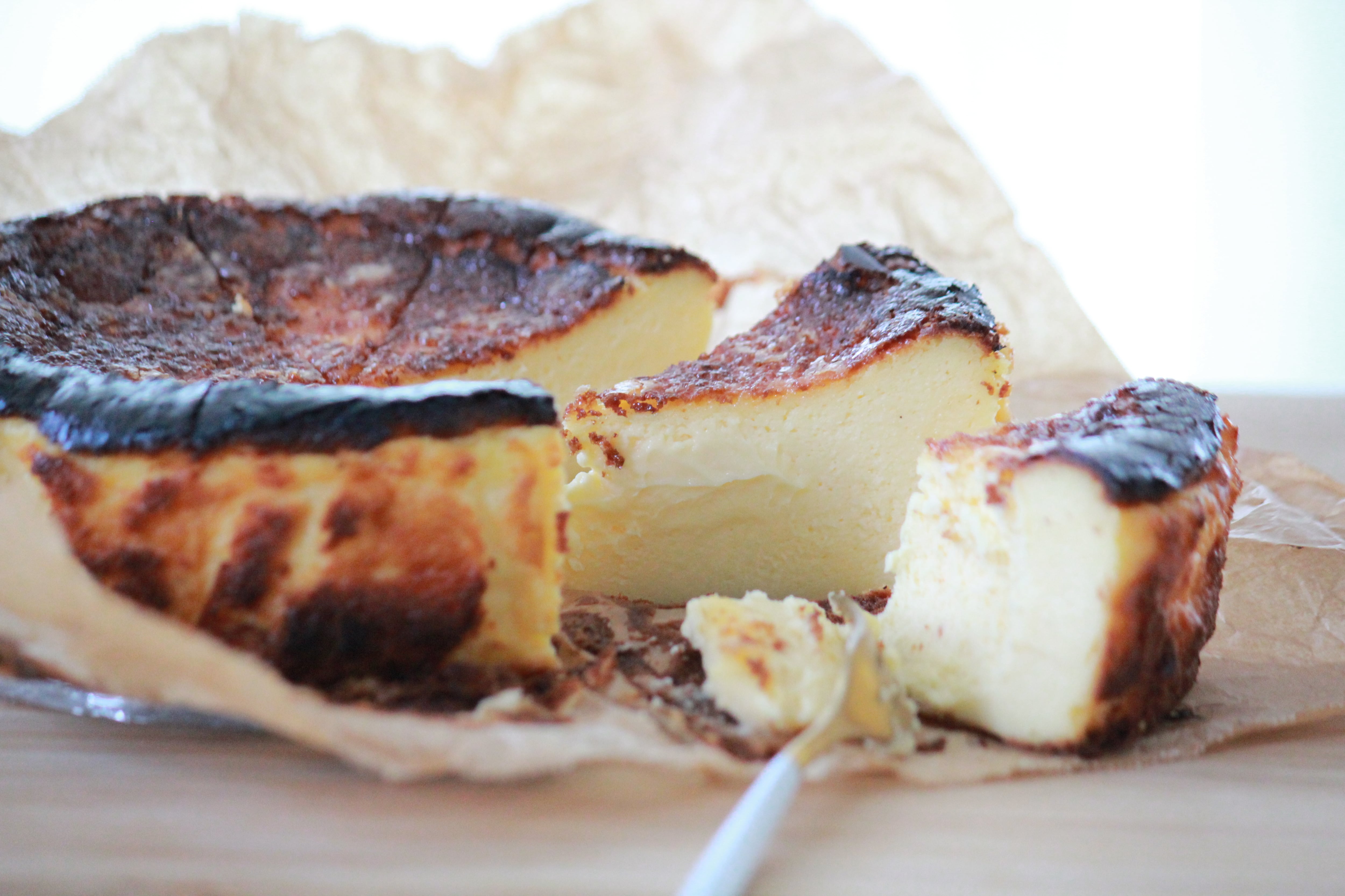 雑に紙を敷き込み、表面はわざと焦がし気味にするスペインの田舎風チーズケーキ。