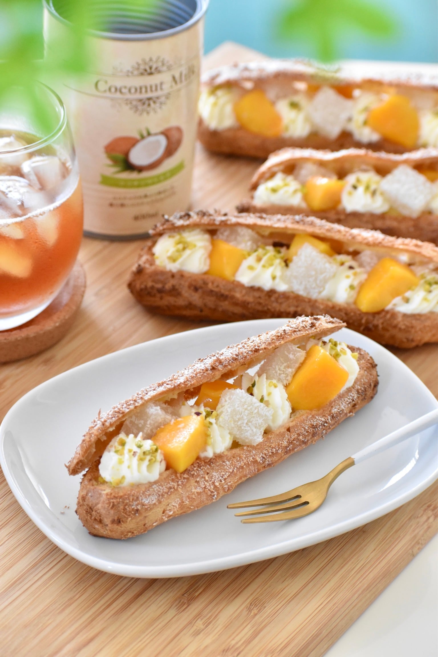 ココナッツ香るパリッとしたシュー皮に、ヨーグルトクリームとマンゴークリームを詰め、生クリームとマンゴーでデコレーションします♪
